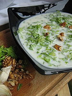 Огурцы очистить, нарезать мелкими брусочками и добавить к ним толченый чеснок. Залить простоквашей или кефиром, размешать, добавить уксус. Смесь разбавить холодной кипяченой водой и положить толченые орехи. Суп заправить нарезанной зеленью укропа и растительным маслом, посолить.