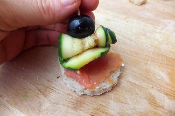 На кусочки хлеба намазать пюре из авокадо тонким слоем, положить кусочек рыбы, ломтик огурца и маслину. Все закрепить зубочисткой.
