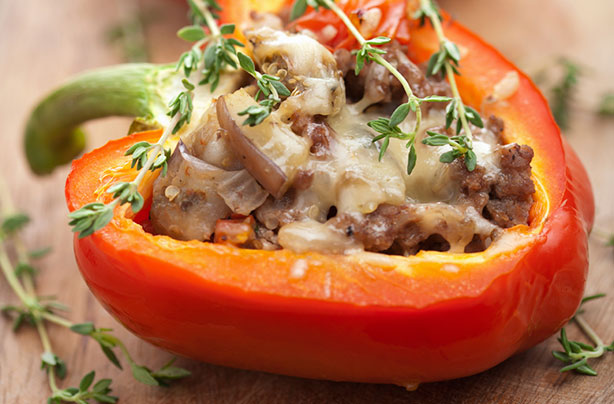 Перец разрезать вдоль пополам, вычистить семена. Наполнить начинкой половинки перца. Выложить на противень и запечь около 15-20 минут в духовке, при 180 С .