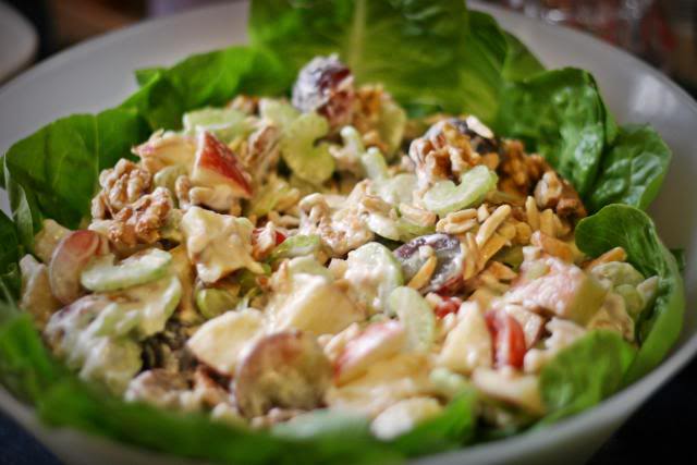 Смешать сельдерей, яблоки, лук и орехи с лимонным соком и майонезом. Все хорошо перемешать. Добавить готовую курицу и снова перемешать.
